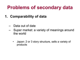 The format of the data can be totally different and the researcher cannot use it in his research. Problems with secondary data. Problems of gathering secondary data in foreign markets.