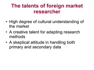 It is time saving. The problems of collecting primary data in foreign countries are different only in degree from those encountered in the United States. Marketing research is what a company has to resort to if it cant answer a question by using market intelligence internal company data or analytical software.